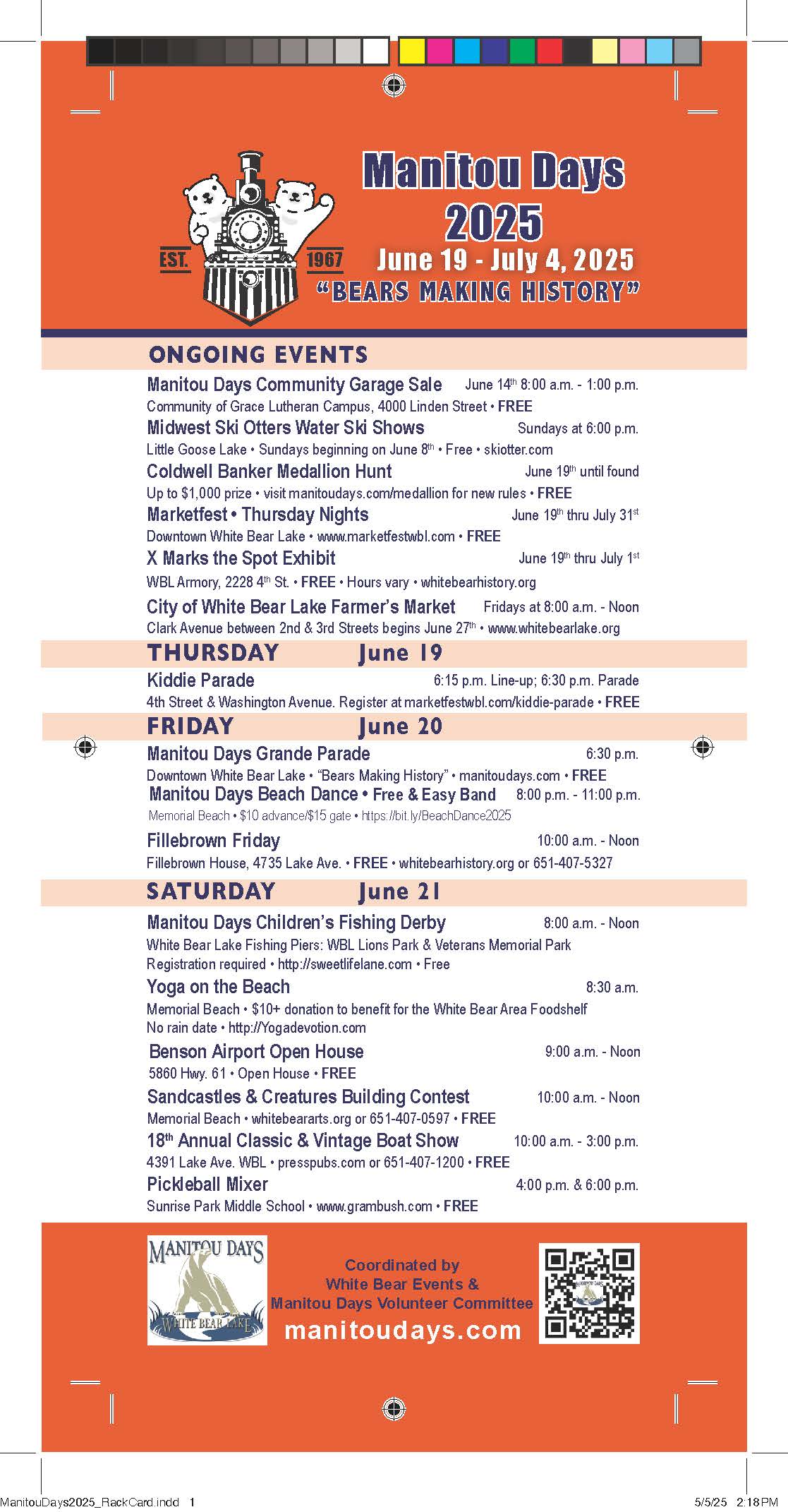 Manitou Days is a three-week summer festival showcasing the great lakeside community of White Bear Lake. For 50+ years this annual summer ritual has been a favorite of locals and visitors.